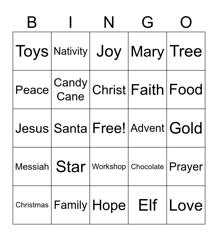 This bingo card has a free space and 24 words: Star, Family, Christ, Christmas, Tree, Toys, Peace, Nativity, Advent, Workshop, Faith, Jesus, Chocolate, Prayer, Candy Cane, Elf, Gold, Joy, Food, Santa, Love, Messiah, Mary and Hope.