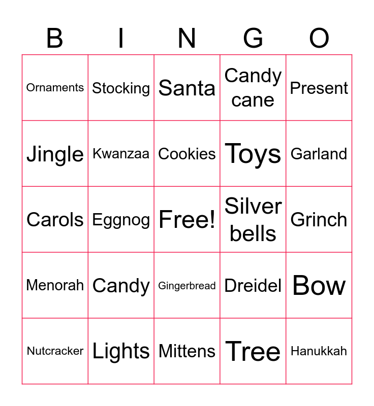 This bingo card has a free space and 32 words: Tree, Snow, Eggnog, Star, Menorah, Kwanzaa, Present, Bow, Stocking, Holly, Cookies, Santa, Elves, Sleigh, Silver bells, Rudolph, Nutcracker, Carols, Gingerbread, Candy, Dreidel, Candle, Grinch, Lights, Hanukkah, Candy cane, Toys, Jingle, Ornaments, Mittens, Snowman and Garland.