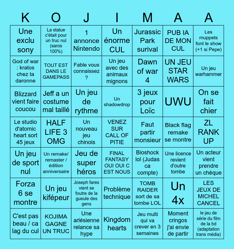 This bingo card has a free space and 48 words: TOMB RAIDER sort de sa tombe LOL, UN JEU STAR WARS, Kingdom hearts, HALF LIFE 3 OMG, Un jeu de rythme, ZL RANK UP, La statue c'était pour un truc nul (saros 100%), KOJIMA GAGNE UN TRUC, PUB IA DE MON CUL, FINAL FANTASY OUI OUI C EST NOUS, Les muppets font le show (+1 si Pepe), Un énorme CUL, UWU, 3 jeux pour Loïc, Forza 6 se montre, Black flag remake se montre, God of war : kratos chez ta daronne, Un jeu warhammer, Un 4x, Jurassic Park surival, Dawn of war 4, Un nouveau jeu chinois, Une exclu sony, TOUT EST DANS LE GAMEPASS, LES JEUX DE MICHEL CANCEL, Fable vous connaissez ?, On se fait chier, C'est pas beau / ca lag du cul, Un shadowdrop, Jeff a un costume mal taillé, Moment cringos j'ai envie de partir, Faut partir monsieur, Un acteur vient prendre un chèque, Un jeu kifépeur, Le studio d'atomic heart sort 45 jeux, Bioshock lol (Judas ca compte), Une licence revient d'outre tombe, Blizzard vient faire coucou, Jeu de super héros, Joseph fares vient se foutre de la gueule des gens, Un jeu de sport nul, le jeu de série du film de la bd (adaptation trans média), 1 annonce Nintendo, Une arlésienne relance sa hype, Un jeu avec des animaux mignons, Problème technique, Un remake/ remaster / édition anniversaire and Jeu multi qui va crever en 3 semaines.