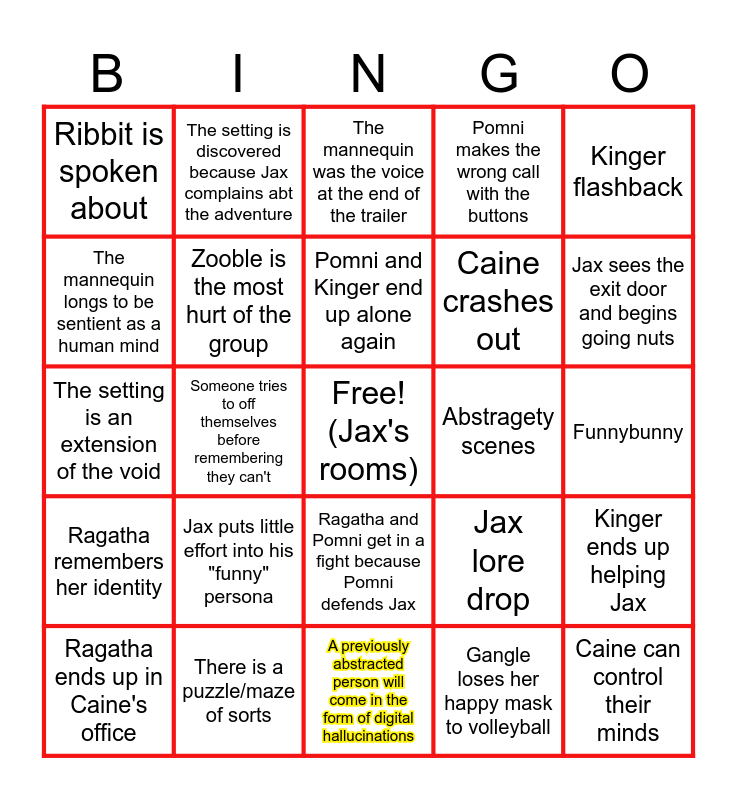 This bingo card has a free space and 24 words: Jax puts little effort into his "funny" persona, There is a puzzle/maze of sorts, Pomni and Kinger end up alone again, Ragatha ends up in Caine's office, Kinger flashback, Ribbit is spoken about, The mannequin longs to be sentient as a human mind, The setting is discovered because Jax complains abt the adventure, Abstragety scenes, Ragatha and Pomni get in a fight because Pomni defends Jax, Caine crashes out, The setting is an extension of the void, Jax lore drop, Kinger ends up helping Jax, Zooble is the most hurt of the group, Gangle loses her happy mask to volleyball, Funnybunny, The mannequin was the voice at the end of the trailer, Jax sees the exit door and begins going nuts, Someone tries to off themselves before remembering they can't, Caine can control their minds, Ragatha remembers her identity, Pomni makes the wrong call with the buttons and A previously abstracted person will come in the form of digital hallucinations.