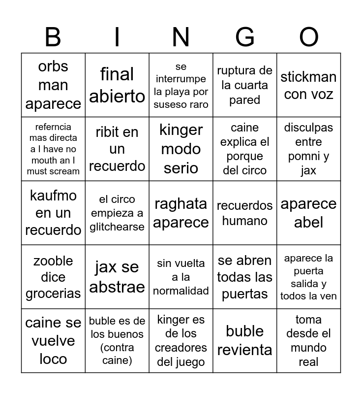 This bingo card has a free space and 24 words: caine se vuelve loco, jax se abstrae, kinger modo serio, buble revienta, stickman con voz, orbs man aparece, final abierto, se interrumpe la playa por suseso raro, recuerdos humano, aparece abel, kaufmo en un recuerdo, ribit en un recuerdo, se abren todas las puertas, aparece la puerta salida y todos la ven, referncia mas directa a I have no mouth an I must scream, buble es de los buenos (contra caine), kinger es de los creadores del juego, ruptura de la cuarta pared, disculpas entre pomni y jax, zooble dice grocerias, el circo empieza a glitchearse, sin vuelta a la normalidad, caine explica el porque del circo and toma desde el mundo real.