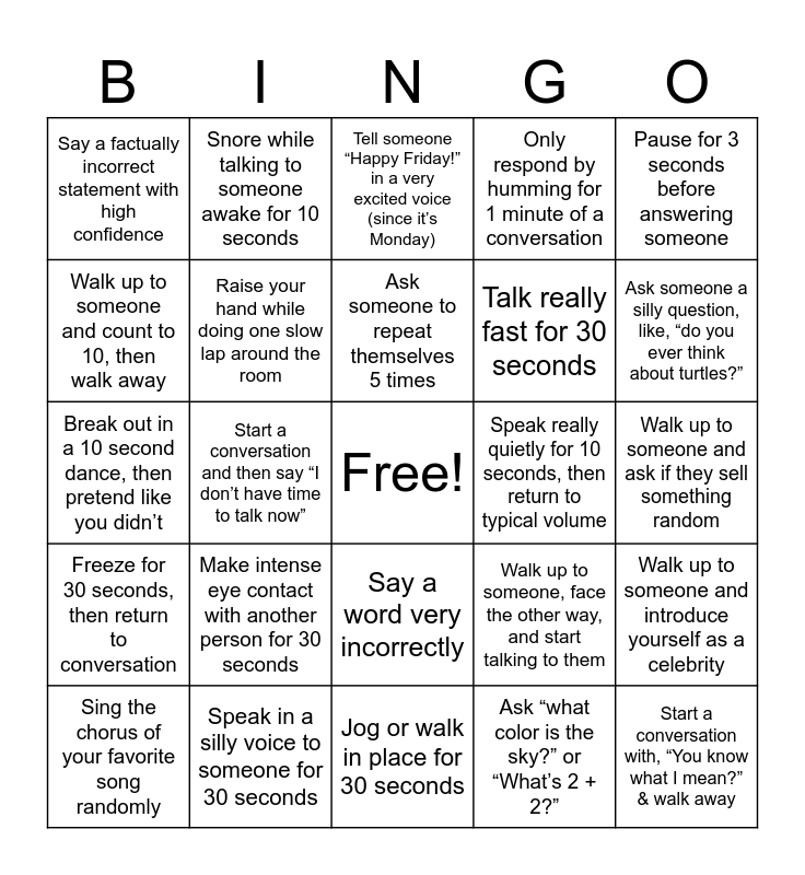 This bingo card has a free space and 24 words: Make intense eye contact with another person for 30 seconds, Speak in a silly voice to someone for 30 seconds, Ask someone to repeat themselves 5 times, Sing the chorus of your favorite song randomly, Pause for 3 seconds before answering someone, Say a factually incorrect statement with high confidence, Walk up to someone and count to 10, then walk away, Snore while talking to someone awake for 10 seconds, Speak really quietly for 10 seconds, then return to typical volume, Say a word very incorrectly, Talk really fast for 30 seconds, Break out in a 10 second dance, then pretend like you didn’t, Walk up to someone, face the other way, and start talking to them, Walk up to someone and introduce yourself as a celebrity, Raise your hand while doing one slow lap around the room, Ask “what color is the sky?” or “What’s 2 + 2?”, Walk up to someone and ask if they sell something random, Tell someone “Happy Friday!” in a very excited voice (since it’s Monday), Ask someone a silly question, like, “do you ever think about turtles?”, Start a conversation and then say “I don’t have time to talk now”, Start a conversation with, “You know what I mean?” & walk away, Freeze for 30 seconds, then return to conversation, Only respond by humming for 1 minute of a conversation and Jog or walk in place for 30 seconds.