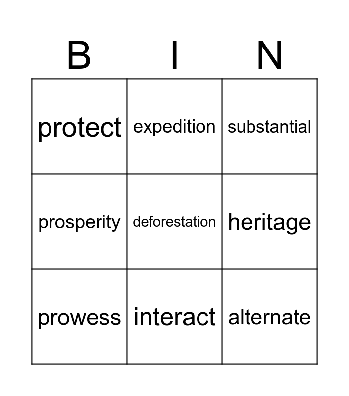 This bingo card has 9 words: prowess, substantial, expedition, prosperity, protect, heritage, deforestation, alternate and interact.