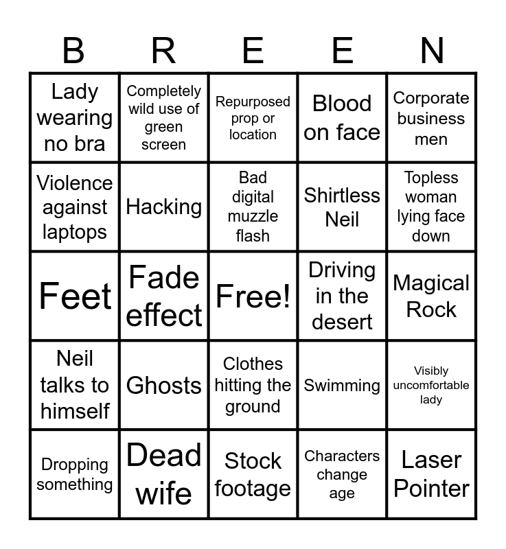 This bingo card has a free space and 29 words: Dropping something, Skull or skeleton, Fade effect, Neil displays magic powers, Lady wearing no bra, Repurposed prop or location, Hacking, Ghosts, Driving in the desert, Dead wife, Magical Rock, Laser Pointer, Stock footage, Characters change age, Topless woman lying face down, Ripped clothes, Clothes hitting the ground, Neil talks to himself, Corporate business men, Feet, Swimming, Someone disappears through basic editing, Shirtless Neil, Violence against laptops, Blood on face, Completely wild use of green screen, Visibly uncomfortable lady, Bad digital muzzle flash and Righteous monologue.