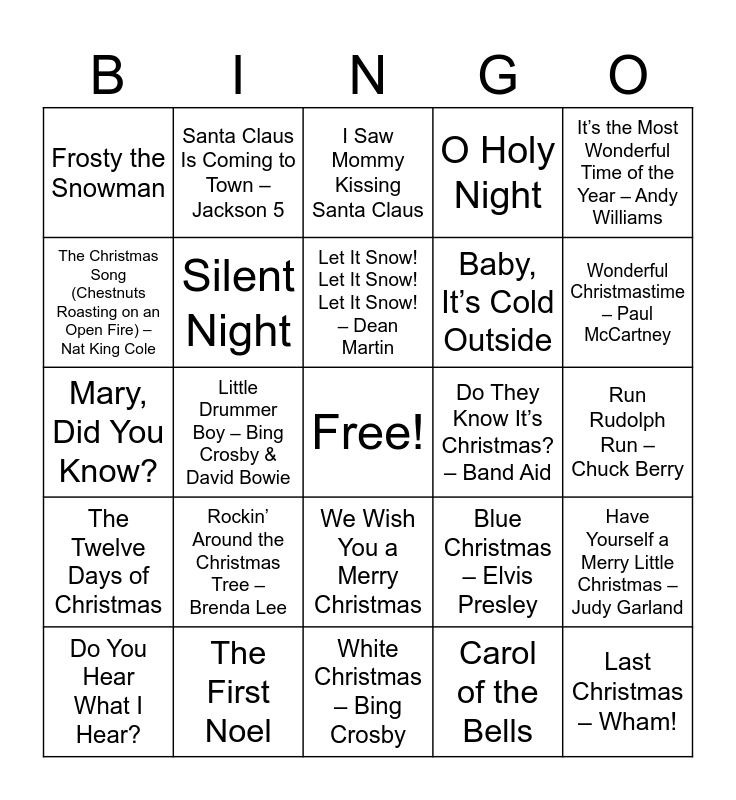 This bingo card has a free space and 50 words: All I Want for Christmas Is You – Mariah Carey, Last Christmas – Wham!, Jingle Bell Rock – Bobby Helms, White Christmas – Bing Crosby, Rockin’ Around the Christmas Tree – Brenda Lee, It’s Beginning to Look a Lot Like Christmas – Michael Bublé, Santa Claus Is Coming to Town – Jackson 5, Feliz Navidad – José Feliciano, The Christmas Song (Chestnuts Roasting on an Open Fire) – Nat King Cole, Holly Jolly Christmas – Burl Ives, Silent Night, O Holy Night, Have Yourself a Merry Little Christmas – Judy Garland, Blue Christmas – Elvis Presley, Sleigh Ride – The Ronettes, Rudolph the Red-Nosed Reindeer – Gene Autry, Let It Snow! Let It Snow! Let It Snow! – Dean Martin, Do They Know It’s Christmas? – Band Aid, Happy Xmas (War Is Over) – John Lennon & Yoko Ono, It’s the Most Wonderful Time of the Year – Andy Williams, Little Drummer Boy – Bing Crosby & David Bowie, Carol of the Bells, Frosty the Snowman, Baby, It’s Cold Outside, Santa Baby – Eartha Kitt, Here Comes Santa Claus – Gene Autry, Wonderful Christmastime – Paul McCartney, Christmas (Baby Please Come Home) – Darlene Love, I Saw Mommy Kissing Santa Claus, We Wish You a Merry Christmas, Away in a Manger, God Rest Ye Merry, Gentlemen, Joy to the World, Deck the Halls, The First Noel, Hark! The Herald Angels Sing, Underneath the Tree – Kelly Clarkson, Merry Christmas, Happy Holidays – *NSYNC, Step Into Christmas – Elton John, Run Rudolph Run – Chuck Berry, Silver Bells, I’ll Be Home for Christmas, This Christmas – Donny Hathaway, Christmas Wrapping – The Waitresses, Do You Hear What I Hear?, Mary, Did You Know?, Auld Lang Syne, Grandma Got Run Over by a Reindeer, The Twelve Days of Christmas and You’re a Mean One, Mr. Grinch.