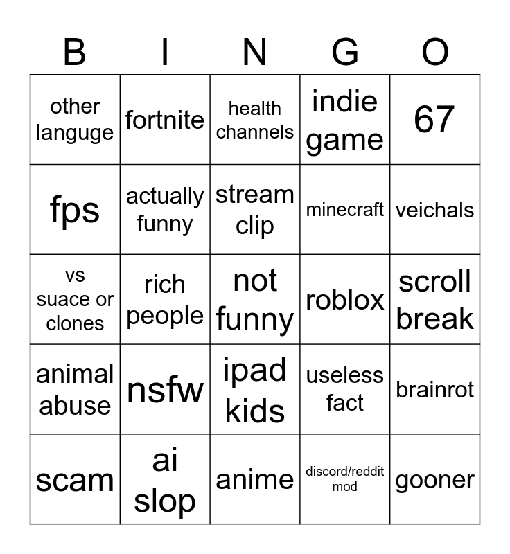 This bingo card has a free space and 24 words: nsfw, ai slop, stream clip, scam, 67, other languge, fps, fortnite, roblox, ipad kids, minecraft, vs suace or clones, useless fact, brainrot, actually funny, discord/reddit mod, scroll break, health channels, veichals, rich people, gooner, animal abuse, indie game and anime.