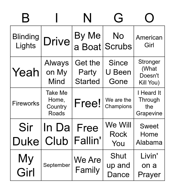 This bingo card has a free space and 95 words: Happy, Best Day of My Life, Shut up and Dance, Hotel California, Shake it Off, Dancing Queen, Don't Stop Me Now, September, Walking on Sunshine, I Wanna Dance with Somebody, Hey Ya!, I Gotta Feeling, Wannabe, Get the Party Started, Uptown Funk, Blinding Lights, Stronger (What Doesn't Kill You), Don't Stop Belivevin, Sweet Caroline, Billie Jean, Girls Just Want to Have Fun, Eye of the Tiger, Man in the Mirror, I Want it That Way, No Scrubs, Yeah, Hey Ya, Since U Been Gone, Crazy in Love, Hollaback Girl, In Da Club, I Will Survive, Lean on Me, Respect, My Girl, Stand By Me, We Are Family, Roar, Fireworks, Counting Stars, Sweet Home Alabama, Take Me Home, Country Roads, Free Fallin', American Girl, We Will Rock You, We are the Champions, Go Your Own Way, Sweet Child O' Mine, Summer of '69, Jack & Diane, Born in the U.S.A, Smells Like Teen Spirit, Zombie, My Own Worst Enemy, Closing Time, Drops of Jupiter, Ring of Fire, Jolene, Achy Breaky Heart, On the Road Again, Always on My Mind, Friends in Low Places, Islands in the Stream, The Gambler, Stand by Your Man, Strawberry Wine, Check Yes or No, Wagon Wheel, By Me a Boat, House Party, Fancy Like, Life is a Highway, Livin' on a Prayer, Piano Man, Jessie's Girl, The Final Countdown, Footloose, All the Small Things, How you Remind ME, Drive, Ain't No Mountain High Enough, RESPECT, Stand by Me, Signed Sealed Delivered, I Heard It Through the Grapevine, Sir Duke, End of the Road, Waterfalls, Un-Break My Heart, Same My Name, This is How We Do It, Irreplaceable, If I Ain't Got You, All of Me and Don't Stop Till You Get Enough.