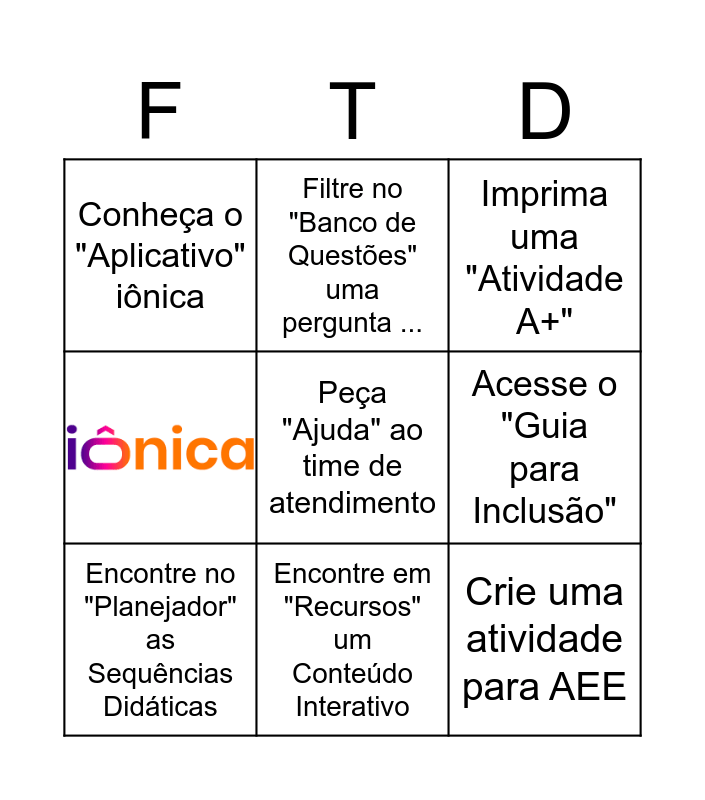 This bingo card has 1 images and 12 words: Explore os submenus da "Biblioteca", Encontre o curso sobre BNCC na "Consultoria On-line", Encontre no "Planejador" as Sequências Didáticas, Filtre no "Banco de Questões" uma pergunta ..., Peça "Ajuda" ao time de atendimento, Crie uma atividade para AEE, "Favorite" um livro, Encontre em "Recursos" um Conteúdo Interativo, Conheça o "Aplicativo" iônica, Acesse o "Guia para Inclusão", Imprima uma "Atividade A+" and Faça uma leitura coletiva da literatura do bimestre.
