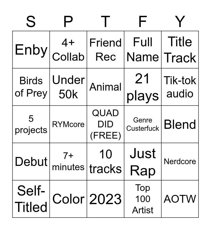 This bingo card has a free space and 24 words: 7+ minutes, Color, Animal, Self-Titled, Title Track, Enby, Birds of Prey, 4+ Collab, Genre Custerfuck, 10 tracks, 21 plays, 5 projects, Just Rap, Nerdcore, Under 50k, Top 100 Artist, Blend, Friend Rec, Tik-tok audio, RYMcore, AOTW, Debut, Full Name and 2023.