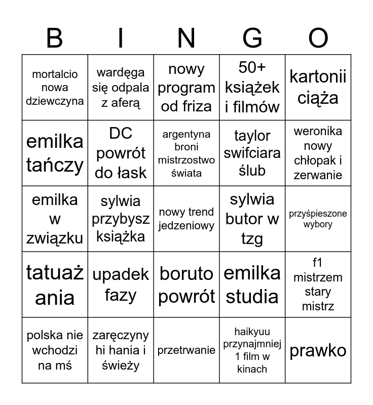 This bingo card has a free space and 24 words: upadek fazy, zaręczyny hi hania i świeży, argentyna broni mistrzostwo świata, polska nie wchodzi na mś, kartonii ciąża, mortalcio nowa dziewczyna, emilka tańczy, wardęga się odpala z aferą, sylwia butor w tzg, boruto powrót, taylor swifciara ślub, emilka w związku, emilka studia, f1 mistrzem stary mistrz, DC powrót do łask, haikyuu przynajmniej 1 film w kinach, przyśpieszone wybory, nowy program od friza, weronika nowy chłopak i zerwanie, sylwia przybysz książka, prawko, tatuaż ania, 50+ książek i filmów and przetrwanie.