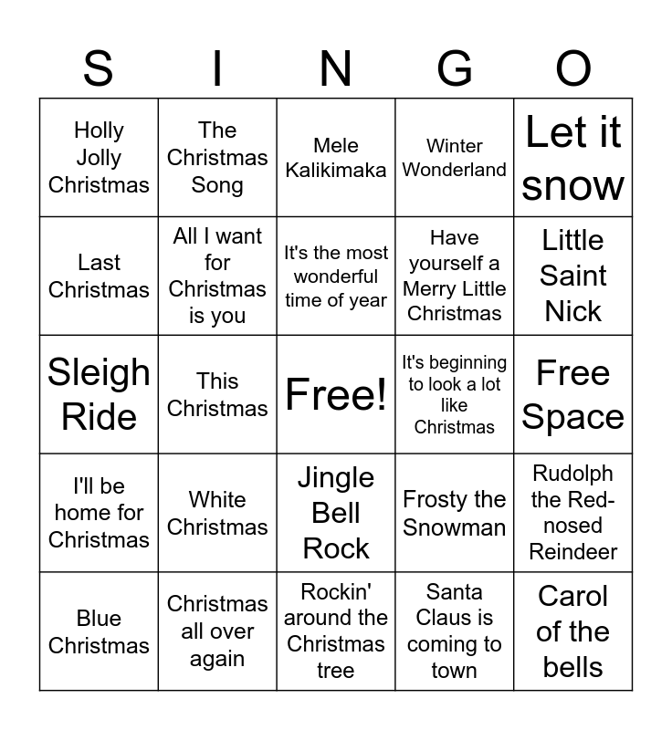 This bingo card has a free space and 25 words: White Christmas, Rockin' around the Christmas tree, It's the most wonderful time of year, Blue Christmas, Let it snow, Holly Jolly Christmas, Last Christmas, The Christmas Song, It's beginning to look a lot like Christmas, Jingle Bell Rock, Have yourself a Merry Little Christmas, Sleigh Ride, Frosty the Snowman, Rudolph the Red-nosed Reindeer, All I want for Christmas is you, Feliz Navidad, Free Space, Mele Kalikimaka, Little Saint Nick, This Christmas, Carol of the bells, Christmas all over again, I'll be home for Christmas, Winter Wonderland and Santa Claus is coming to town.