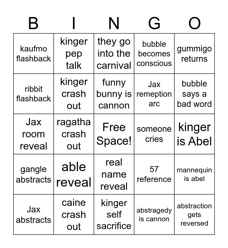 This bingo card has a free space and 24 words: able reveal, caine crash out, funny bunny is cannon, Jax abstracts, gummigo returns, kaufmo flashback, ribbit flashback, kinger pep talk, someone cries, real name reveal, Jax remeption arc, Jax room reveal, 57 reference, mannequin is abel, kinger crash out, abstragedy is cannon, kinger is Abel, they go into the carnival, bubble says a bad word, ragatha crash out, abstraction gets reversed, gangle abstracts, bubble becomes conscious and kinger self sacrifice.