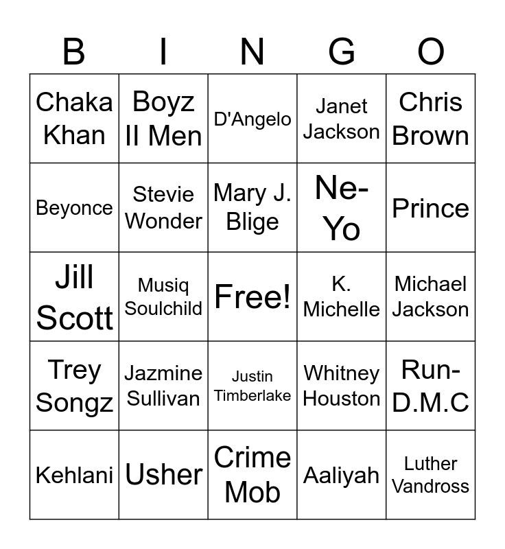This bingo card has a free space and 24 words: Jazmine Sullivan, Usher, Mary J. Blige, Kehlani, Chris Brown, Chaka Khan, Beyonce, Boyz II Men, K. Michelle, Justin Timberlake, Ne-Yo, Jill Scott, Whitney Houston, Run-D.M.C, Stevie Wonder, Aaliyah, Michael Jackson, D'Angelo, Prince, Musiq Soulchild, Luther Vandross, Trey Songz, Janet Jackson and Crime Mob.