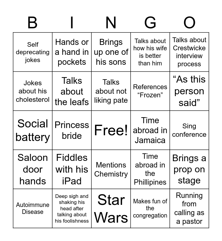 This bingo card has a free space and 31 words: Star Wars, Hamilton, Princess bride, Laughs at his own jokes, Self deprecating jokes, Brings up one of his sons, Talks about the leafs, Time abroad in the Phillipines, Time abroad in Jamaica, Makes fun of the congregation, Sing conference, Running from calling as a pastor, Basketball, Mentions his brisket/cooking, “As this person said”, Quotes Tom Schreiner, Brings a prop on stage, Fiddles with his iPad, Saloon door hands, Mentions Chemistry, Talks about Crestwicke interview process, Jokes about age gap between Daniel and Johann, Autoimmune Disease, Hands or a hand in pockets, References “Frozen”, Jokes about his cholesterol, Talks about how his wife is better than him, Social battery, Deep sigh and shaking his head after talking about his foolishness, Talks about not liking pate and Does a villain voice for bad guys in the scripture reading.