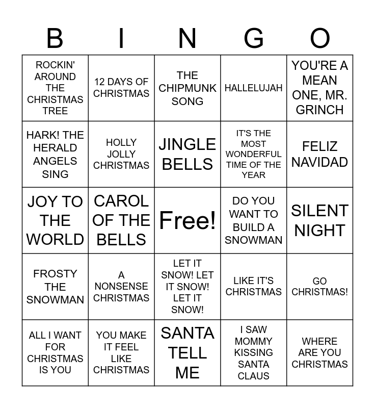 This bingo card has a free space and 56 words: FREE, ALL I WANT FOR CHRISTMAS IS YOU, LAST CHRISTMAS, ROCKIN' AROUND THE CHRISTMAS TREE, SANTA TELL ME, JINGLE BELL ROCK, HOLLY JOLLY CHRISTMAS, MISTLETOE, IT'S THE MOST WONDERFUL TIME OF THE YEAR, IT'S BEGINNING TO LOOK A LOT LIKE CHRISTMAS, HALLELUJAH, O HOLY NIGHT, BLUE CHRISTMAS, RUDOLPH THE RED-NOSED REINDEER, LAST CHRISTMAS, HAVE YOURSELF A MERRY LITTLE CHRISTMAS, YOU'RE A MEAN ONE, MR. GRINCH, CAROL OF THE BELLS, BABY, IT'S COLD OUTSIDE, WHERE ARE YOU CHRISTMAS, DO YOU WANT TO BUILD A SNOWMAN, BELIEVE, LIKE IT'S CHRISTMAS, THE CHIPMUNK SONG, I WANT A HIPPOPOTAMUS FOR CHRISTMAS, JINGLE BELLS, SLEIGH RIDE, DECK THE HALL, FELIZ NAVIDAD, LITTLE SAINT NICK, CHRISTMAS TIME IS HERE, DO YOU HEAR WHAT I HEAR?, SILVER BELLS, I'LL BE HOME FOR CHRISTMAS, SILENT NIGHT, HARK! THE HERALD ANGELS SING, JOY TO THE WORLD, SANTA CLAUS IS COMING TO TOWN, FROSTY THE SNOWMAN, 12 DAYS OF CHRISTMAS, LET IT SNOW! LET IT SNOW! LET IT SNOW!, WE WISH YOU A MERRY CHRISTMAS, UP ON THE HOUSETOP, UNDERNEATH THE TREE, SNOWMAN, A NONSENSE CHRISTMAS, YOU MAKE IT FEEL LIKE CHRISTMAS, PLEASE COME HOME FOR CHRISTMAS, WHITE CHRISTMAS, MARY, DID YOU KNOW?, I SAW MOMMY KISSING SANTA CLAUS, SILENT NIGHT, COZY LITTLE CHRISTMAS, SILVER BELLS, GO CHRISTMAS! and I WISH IT COULD BE CHRISTMAS EVERYDAY.