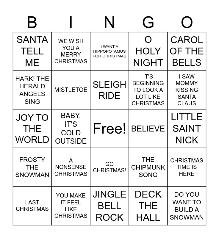 This bingo card has a free space and 55 words: ALL I WANT FOR CHRISTMAS IS YOU, LAST CHRISTMAS, ROCKIN' AROUND THE CHRISTMAS TREE, SANTA TELL ME, JINGLE BELL ROCK, HOLLY JOLLY CHRISTMAS, MISTLETOE, IT'S THE MOST WONDERFUL TIME OF THE YEAR, IT'S BEGINNING TO LOOK A LOT LIKE CHRISTMAS, HALLELUJAH, O HOLY NIGHT, BLUE CHRISTMAS, RUDOLPH THE RED-NOSED REINDEER, LAST CHRISTMAS, HAVE YOURSELF A MERRY LITTLE CHRISTMAS, YOU'RE A MEAN ONE, MR. GRINCH, CAROL OF THE BELLS, BABY, IT'S COLD OUTSIDE, WHERE ARE YOU CHRISTMAS, DO YOU WANT TO BUILD A SNOWMAN, BELIEVE, LIKE IT'S CHRISTMAS, THE CHIPMUNK SONG, I WANT A HIPPOPOTAMUS FOR CHRISTMAS, JINGLE BELLS, SLEIGH RIDE, DECK THE HALL, FELIZ NAVIDAD, LITTLE SAINT NICK, CHRISTMAS TIME IS HERE, DO YOU HEAR WHAT I HEAR?, SILVER BELLS, I'LL BE HOME FOR CHRISTMAS, SILENT NIGHT, HARK! THE HERALD ANGELS SING, JOY TO THE WORLD, SANTA CLAUS IS COMING TO TOWN, FROSTY THE SNOWMAN, 12 DAYS OF CHRISTMAS, LET IT SNOW! LET IT SNOW! LET IT SNOW!, WE WISH YOU A MERRY CHRISTMAS, UP ON THE HOUSETOP, UNDERNEATH THE TREE, SNOWMAN, A NONSENSE CHRISTMAS, YOU MAKE IT FEEL LIKE CHRISTMAS, PLEASE COME HOME FOR CHRISTMAS, WHITE CHRISTMAS, MARY, DID YOU KNOW?, I SAW MOMMY KISSING SANTA CLAUS, SILENT NIGHT, COZY LITTLE CHRISTMAS, SILVER BELLS, GO CHRISTMAS! and I WISH IT COULD BE CHRISTMAS EVERYDAY.