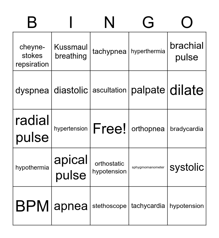 This bingo card has a free space and 24 words: apical pulse, apnea, ascultation, BPM, brachial pulse, cheyne-stokes repsiration, dyspnea, Kussmaul breathing, orthopnea, orthostatic hypotension, palpate, radial pulse, sphygmomanometer, systolic, diastolic, tachycardia, bradycardia, tachypnea, dilate, hypertension, hypotension, hypothermia, hyperthermia and stethoscope.