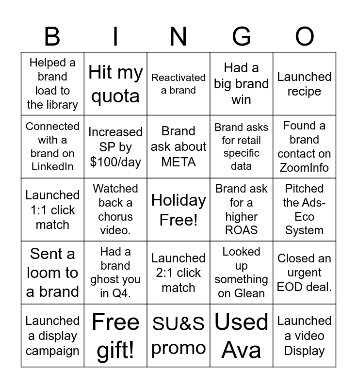This bingo card has a free space and 24 words: Had a brand ghost you in Q4., Free gift!, Brand ask about META, Launched a display campaign, Launched recipe, Helped a brand load to the library, Connected with a brand on LinkedIn, Hit my quota, Brand ask for a higher ROAS, Launched 2:1 click match, Brand asks for retail specific data, Launched 1:1 click match, Looked up something on Glean, Closed an urgent EOD deal., Increased SP by $100/day, Used Ava, Pitched the Ads-Eco System, Reactivated a brand, Found a brand contact on ZoomInfo, Watched back a chorus video., Launched a video Display, Sent a loom to a brand, Had a big brand win and SU&S promo.