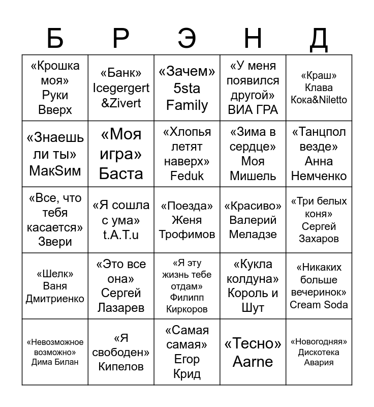 This bingo card has 35 words: «Цыпа» Котенок Котэ, «Царица» Anna Asti, «Я поднимаю руки» Григорий Лепс, «Моя игра» Баста, «Я эту жизнь тебе отдам» Филипп Киркоров, «У меня появился другой» ВИА ГРА, «Знаешь ли ты» МакSим, «Хоп Хей ла ла лей» Леонид Агутин, «Хлопья летят наверх» Feduk, «Ameli» Big Baby Tape, «Все, что тебя касается» Звери, «Краш» Клава Кока&Niletto, «Танцы» Андрей Губин, «Батарейка» Жуки, «Крошка моя» Руки Вверх, «Красиво» Валерий Меладзе, «Тесно» Aarne, «Я сошла с ума» t.A.T.u, «Шелк» Ваня Дмитриенко, «Поезда» Женя Трофимов, «Кукла колдуна» Король и Шут, «Невозможное возможно» Дима Билан, «Никаких больше вечеринок» Cream Soda, «Я свободен» Кипелов, «Зачем» 5sta Family, «Танцпол везде» Анна Немченко, «Новогодняя» Дискотека Авария, «Базовый минимум» Mia Boyka, «Зима в сердце» Моя Мишель, «Три белых коня» Сергей Захаров, «Знаешь ли ты» МакSим, «Самая самая» Егор Крид, «Это все она» Сергей Лазарев, «Банк» Icegergert &Zivert and «Все, что тебя касается» Звери.