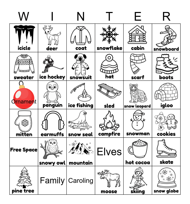 This bingo card has 38 images and 5 words: Ornament, Family, Caroling, Elves and Candy Cane.