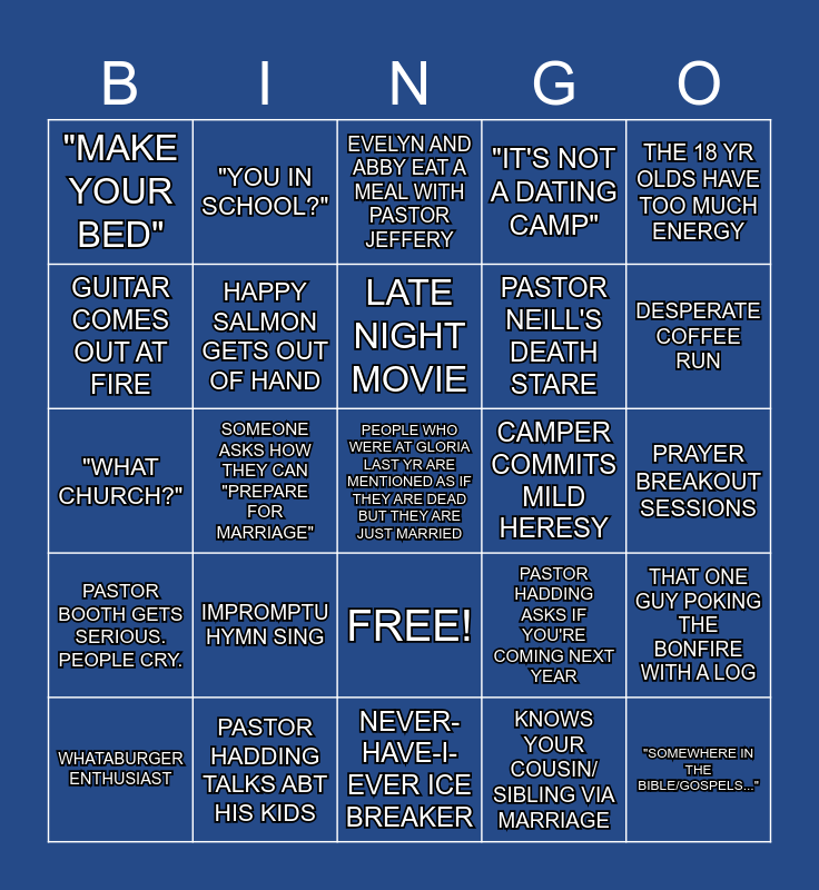 This bingo card has 35 words: PASTOR NEILL'S WEIRD ANALOGY, DINNER IS PHILLY CHEESESTEAKS, PSJ PLAYS JAZZ, PASTOR NEILL'S DEATH STARE, "SOMEWHERE IN THE BIBLE/GOSPELS...", "MAKE YOUR BED", HAPPY SALMON GETS OUT OF HAND, HEATED THEO DEBATE, CAMPER COMMITS MILD HERESY, CAMPER ASKS CONCERNING QUESTION, "WHAT CHURCH?", "YOU IN SCHOOL?", FREE!, PASTOR B: “MOST GLORIOUS MOMENT OF WEDDING”, THE 18 YR OLDS HAVE TOO MUCH ENERGY, PASTOR BOOTH GETS SERIOUS. PEOPLE CRY., PASTOR HADDING TALKS ABT HIS KIDS, EVELYN AND ABBY EAT A MEAL WITH PASTOR JEFFERY, KNOWS YOUR COUSIN/ SIBLING VIA MARRIAGE, PRAYER BREAKOUT SESSIONS, WHATABURGER ENTHUSIAST, SOMEONE ASKS HOW THEY CAN "PREPARE FOR MARRIAGE", PEOPLE WHO WERE AT GLORIA LAST YR ARE MENTIONED AS IF THEY ARE DEAD BUT THEY ARE JUST MARRIED, PASTOR B: "JUST MEMORIZE SCRIPTURE ALREADY", DESPERATE COFFEE RUN, GUITAR COMES OUT AT FIRE, GROGGY MORNING CHAPEL, NEVER-HAVE-I-EVER ICE BREAKER, PASTOR HADDING ASKS IF YOU'RE COMING NEXT YEAR, THAT ONE GUY POKING THE BONFIRE WITH A LOG, PSJ SAYS SOMETHING NICE ABT MRS JEFFERY, IMPROMPTU HYMN SING, LATE NIGHT MOVIE, "IT'S NOT A DATING CAMP" and SOMEONE COMPLAINS.