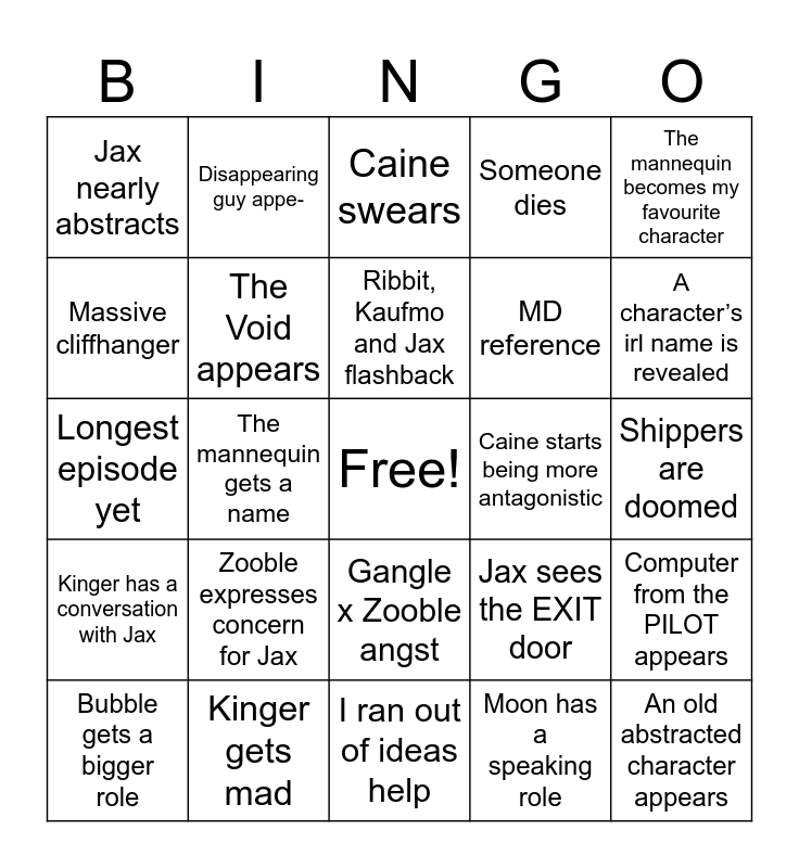 This bingo card has a free space and 24 words: Zooble expresses concern for Jax, Kinger gets mad, Ribbit, Kaufmo and Jax flashback, Bubble gets a bigger role, The mannequin becomes my favourite character, Jax nearly abstracts, Massive cliffhanger, Disappearing guy appe-, Caine starts being more antagonistic, Gangle x Zooble angst, MD reference, Longest episode yet, Jax sees the EXIT door, Computer from the PILOT appears, The Void appears, Moon has a speaking role, Shippers are doomed, Caine swears, A character’s irl name is revealed, The mannequin gets a name, An old abstracted character appears, Kinger has a conversation with Jax, Someone dies and I ran out of ideas help.