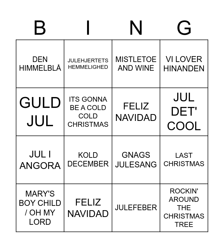 This bingo card has 97 words: Free!, ALL I WANT FOR CHRISTMAS IS YOU, DER' NOGET I DECEMBER, LAST CHRISTMAS, TINKA, SANTA TELL ME, LET LOVE BE LOVE, KONGESPIL, MY ONLY WISH (THIS YEAR), JULEHJERTETS HEMMELIGHED, DRIVING HOBE FOR CHRISTMAS, JESUS & JOSEFINE, I EN STJERNEREGN AF SNE, ROCKIN' AROUND THE CHRISTMAS TREE, FINALLY IT'S CHRISTMAS AGAIN, DEN HIMMELBLÅ, GULD JUL, JINGLE BELL ROCK, NÅR SNEEN FALDER, IT'S BEGINNING TO LOOK A LOT LIKE CHRISTMAS, DO THEY KNOW IT'S CHRISTMAS, SNOWMAN, JUL I ANGORA, HAPPY XMAS (WAR IS OVER), NU ER ET JUL, JUL DET' COOL, STJERNESTØV, THANK GOD IT'S CHRISTMAS, LILLE MESSIAS, JUL PÅ VESTERBRO, FELIZ NAVIDAD, VI LOVER HINANDEN, WINTER WONDERLAND, KOLD DECEMBER, ENDELIG JUL IGEN, VIL DU VÆRE MIN I NAT, WONDERFUL CHRISTMASTIME, THE STØVLE DANCE, MARY'S BOY CHILD / OH MY LORD, GNAGS JULESANG, MERRY XMAS EVERYBODY, JULEFEBER, MISTLETOE AND WINE, MISTLETOE, CHRISTMAS TIME, SANTA BABY, ITS GONNA BE A COLD COLD CHRISTMAS, HAVE YOUSELF A MERRY LITTLE CHRISTMAS, RAP JUL, ALL I WANT FOR CHRISTMAS IS YOU, DER' NOGET I DECEMBER, LAST CHRISTMAS, TINKA, SANTA TELL ME, LET LOVE BE LOVE, KONGESPIL, MY ONLY WISH (THIS YEAR), JULEHJERTETS HEMMELIGHED, DRIVING HOME FOR CHRISTMAS, JESUS & JOSEFINE, I EN STJERNEREGN AF SNE, ROCKIN' AROUND THE CHRISTMAS TREE, FINALLY IT'S CHRISTMAS AGAIN, DEN HIMMELBLÅ, GULD JUL, JINGLE BELL ROCK, NÅR SNEEN FALDER, IT'S BEGINNING TO LOOK A LOT LIKE CHRISTMAS, DO THEY KNOW IT'S CHRISTMAS, SNOWMAN, JUL I ANGORA, HAPPY XMAS (WAR IS OVER), NU ER ET JUL, JUL DET' COOL, STJERNESTØV, THANK GOD IT'S CHRISTMAS, LILLE MESSIAS, JUL PÅ VESTERBRO, FELIZ NAVIDAD, VI LOVER HINANDEN, WINTER WONDERLAND, KOLD DECEMBER, ENDELIG JUL IGEN, VIL DU VÆRE MIN I NAT, WONDERFUL CHRISTMASTIME, THE STØVLE DANCE, MARY'S BOY CHILD / OH MY LORD, GNAGS JULESANG, MERRY XMAS EVERYBODY, JULEFEBER, MISTLETOE AND WINE, MISTLETOE, CHRISTMAS TIME, SANTA BABY, ITS GONNA BE A COLD COLD CHRISTMAS, HAVE YOUSELF A MERRY LITTLE CHRISTMAS and RAP JUL.