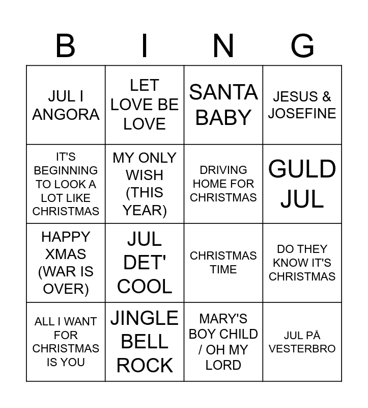 This bingo card has 49 words: Free!, ALL I WANT FOR CHRISTMAS IS YOU, DER' NOGET I DECEMBER, LAST CHRISTMAS, TINKA, SANTA TELL ME, LET LOVE BE LOVE, KONGESPIL, MY ONLY WISH (THIS YEAR), JULEHJERTETS HEMMELIGHED, DRIVING HOME FOR CHRISTMAS, JESUS & JOSEFINE, I EN STJERNEREGN AF SNE, ROCKIN' AROUND THE CHRISTMAS TREE, FINALLY IT'S CHRISTMAS AGAIN, DEN HIMMELBLÅ, GULD JUL, JINGLE BELL ROCK, NÅR SNEEN FALDER, IT'S BEGINNING TO LOOK A LOT LIKE CHRISTMAS, DO THEY KNOW IT'S CHRISTMAS, SNOWMAN, JUL I ANGORA, HAPPY XMAS (WAR IS OVER), NU ER ET JUL, JUL DET' COOL, STJERNESTØV, THANK GOD IT'S CHRISTMAS, LILLE MESSIAS, JUL PÅ VESTERBRO, FELIZ NAVIDAD, VI LOVER HINANDEN, WINTER WONDERLAND, KOLD DECEMBER, ENDELIG JUL IGEN, VIL DU VÆRE MIN I NAT, WONDERFUL CHRISTMASTIME, THE STØVLE DANCE, MARY'S BOY CHILD / OH MY LORD, GNAGS JULESANG, MERRY XMAS EVERYBODY, JULEFEBER, MISTLETOE AND WINE, MISTLETOE, CHRISTMAS TIME, SANTA BABY, ITS GONNA BE A COLD COLD CHRISTMAS, HAVE YOUSELF A MERRY LITTLE CHRISTMAS and RAP JUL.