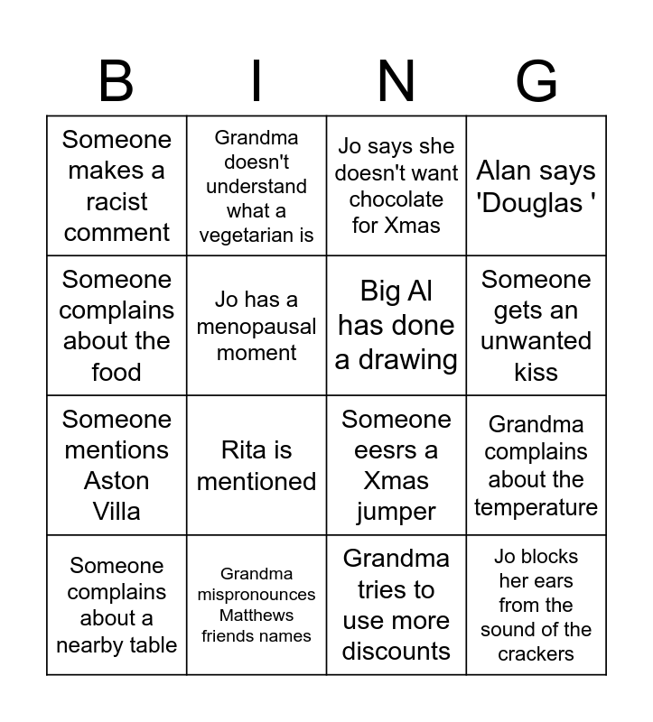 This bingo card has 24 words: Someone mispronounces a menu item, Someone recieves cash, Someone gets an unwanted kiss, Jo and Alan argue, Someone complains about the food, Someone makes a racist comment, Jo has a menopausal moment, Grandma doesn't understand what a vegetarian is, Grandma mispronounces Matthews friends names, Someone makes a sexual comments, Someone mentions Aston Villa, Someone eesrs a Xmas jumper, Jo pays, Jo speaks negatively about Carl, Big Al has done a drawing, Andy is mentioned, Grandma tries to use more discounts, Jo says she doesn't want chocolate for Xmas, Rita is mentioned, Grandma complains about the temperature, Someone complains about a nearby table, Jo blocks her ears from the sound of the crackers, Alan says 'Douglas ' and Grandma mentions heating.