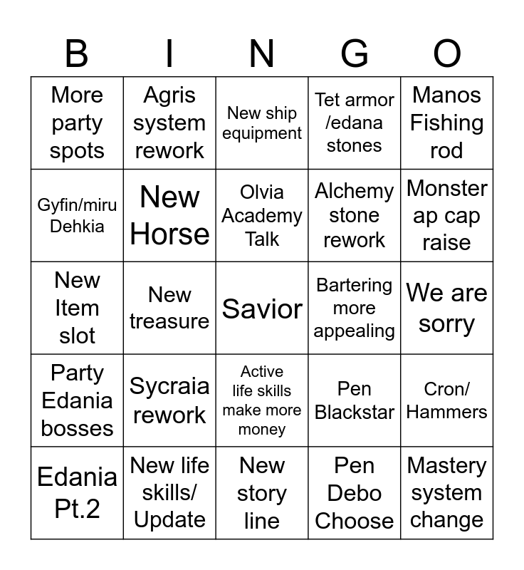 This bingo card has a free space and 24 words: Sycraia rework, New life skills/ Update, Olvia Academy Talk, Edania Pt.2, Manos Fishing rod, More party spots, Gyfin/miru Dehkia, Agris system rework, Bartering more appealing, Active life skills make more money, Alchemy stone rework, New Item slot, Pen Blackstar, Cron/ Hammers, New Horse, Pen Debo Choose, We are sorry, New ship equipment, Monster ap cap raise, New treasure, Mastery system change, Party Edania bosses, Tet armor /edana stones and New story line.