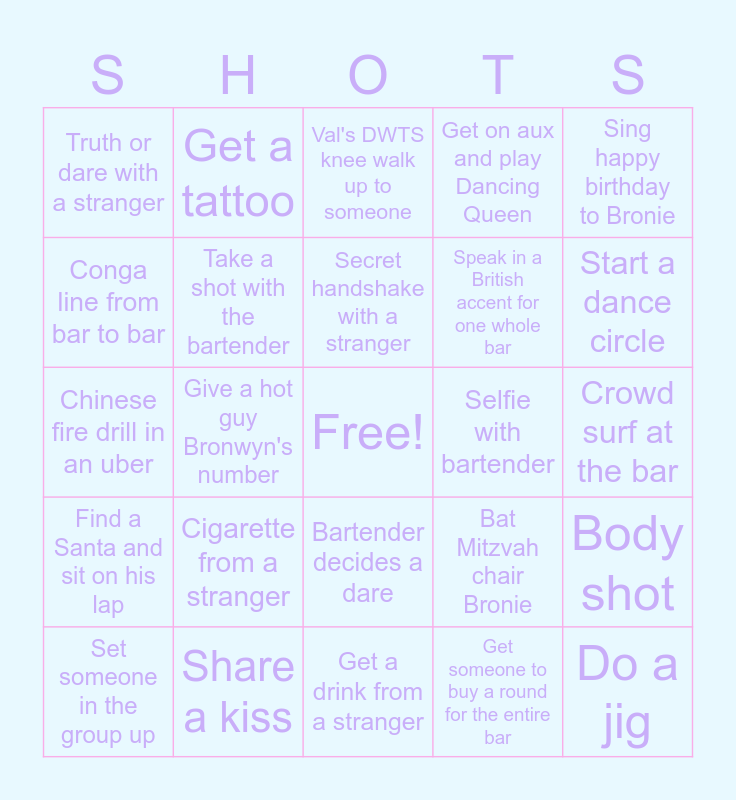 This bingo card has a free space and 34 words: Take a Santa hat from a stranger, Group photo, Order a mystery drink, Buy Bronwyn a shot, Crowd surf at the bar, Conga line from bar to bar, Take a shot with the bartender, Get a drink from a stranger, Speak in a British accent for one whole bar, Do a jig, Chinese fire drill in an uber, Get a tattoo, Get someone to buy a round for the entire bar, Switch shirts with a stranger, Find a Santa and sit on his lap, Give a hot guy Bronwyn's number, Bartender decides a dare, Selfie with bartender, Body shot, Set someone in the group up, Share a kiss, Race a stranger to the next destination, Get on aux and play Dancing Queen, Start a dance circle, Do a toast, Cigarette from a stranger, Val's DWTS knee walk up to someone, Do a baby freeze at the bar, Sing happy birthday to Bronie, Truth or dare with a stranger, Chug a beer on one knee, Secret handshake with a stranger, Bat Mitzvah chair Bronie and Steal someone's lime wedge.
