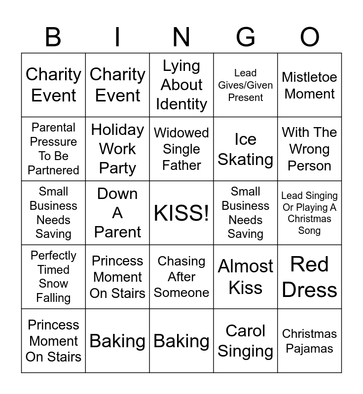 ⚠ This card has duplicate items: Christmas Day Parade (2), Baking (2), Decorating Christmas Tree (2), Perfectly Timed Snow Falling (2), Lead is a Love/Christmas Cynic (2), Small Town Tradition Event (2), Holiday Work Party (2), Last Minute Save The Day Moment (2), Ice Skating (2), Big Argument (2), Lead Gives/Given Present (2), Someone Falls (2), Parental Pressure To Be Partnered (2), Christmas Eve/Day Deadline (2), Lead Singing Or Playing A Christmas Song (2), Charity Event (2), Christmas Pajamas (2), Mistletoe Moment (2), Down A Parent (2), Widowed Single Father (2), Small Business Needs Saving (2), Lying About Identity (2), Princess Moment On Stairs (2), Carol Singing (2), With The Wrong Person (2), Almost Kiss (2), Vulnerable Moment (2), Lead Man Is Good With Kids (2), Red Dress (2), Coaxed To Dance (2), Chasing After Someone (2)