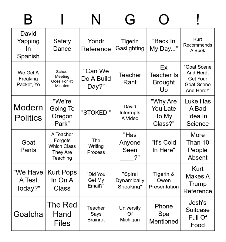 This bingo card has 36 words: "Spiral Dynamically Speaking", "Did You Get My Email?", University Of Michigan, We Get A Freaking Packet, Yo, Goat Pants, David Interrupts A Video, School Meeting Goes For 45 Minutes, Teacher Says Brainrot, "Back In My Day...", Tigerin & Owen Presentation, "Goat Scene And Herd, Get Your Goat Scene And Herd!", Tigerin Gaslighting, Kurt Makes A Trump Reference, "We're Going To Oregon Park", Teacher Rant, David Yapping In Spanish, "We Have A Test Today?", "Why Are You Late To My Class?", Modern Politics, Yondr Reference, "STOKED!", A Teacher Forgets Which Class They Are Teaching, "Has Anyone Seen ____?", The Writing Process, "It's Cold In Here", Safety Dance, Ex Teacher Is Brought Up, The Red Hand Files, "Can We Do A Build Day?", Kurt Recommends A Book, Josh's Suitcase Full Of Food, Goatcha, More Than 10 People Absent, Luke Has A Bad Idea In Science, Kurt Pops In On A Class and Phone Spa Mentioned.