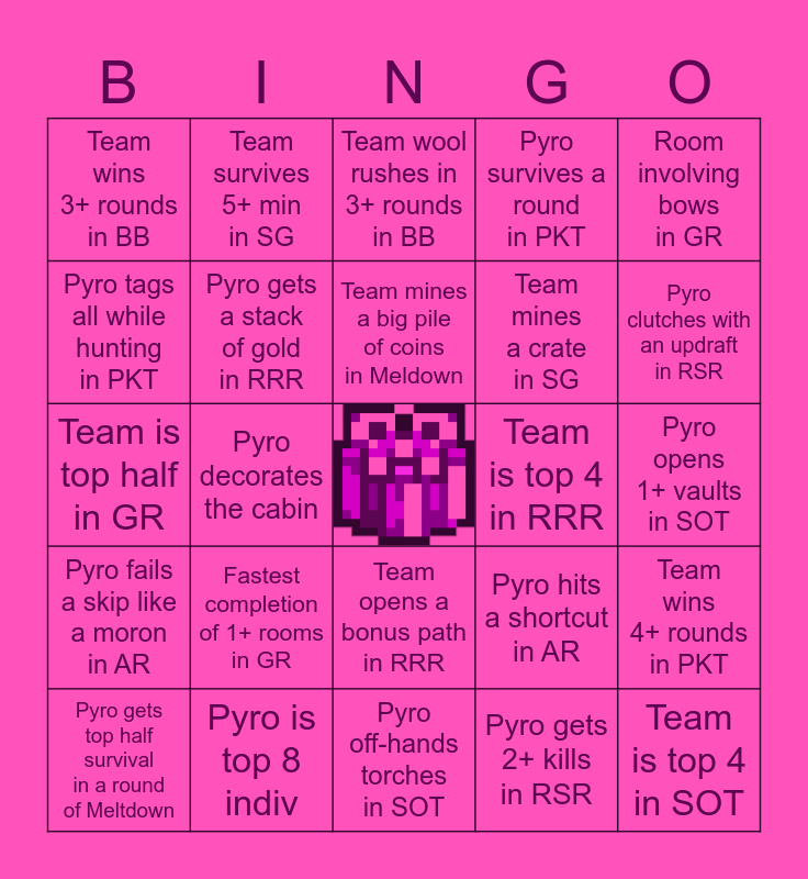 This bingo card has a free space and 30 words: Pyro is top 8 indiv, Pyro gifts 4 presents in one round on break, Pyro decorates the cabin, Pyro goes for a swim in BB, Team wins 3+ rounds in BB, Team wool rushes in 3+ rounds in BB, Pyro gets a stack of gold in RRR, Team opens a bonus path in RRR, Team is top 4 in RRR, Pyro off-hands torches in SOT, Pyro opens 1+ vaults in SOT, Team is top 4 in SOT, Pyro gets 2+ kills in RSR, Pyro is top 5 in a round of RSR, Pyro clutches with an updraft in RSR, Half the team is top 15 in AR, Pyro hits a shortcut in AR, Pyro fails a skip like a moron in AR, Fastest completion of 1+ rooms in GR, Room involving bows in GR, Team is top half in GR, Pyro gets 1+ kills in SG, Team survives 5+ min in SG, Team mines a crate in SG, Pyro tags all while hunting in PKT, Pyro survives a round in PKT, Team wins 4+ rounds in PKT, Pyro gets top half survival in a round of Meltdown, Team mines a big pile of coins in Meldown and Team isn't first one to die in Meltdown.