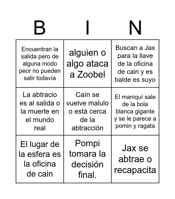 This bingo card has a free space and 8 words: El maniquí sale de la bola blanca gigante y se le parece a pomin y ragata, Buscan a Jax para la llave de la oficina de cain y es balde es suyo, alguien o algo ataca a Zoobel, El lugar de la esfera es la oficina de cain, Encuentran la salida pero de alguna modo peor no pueden salir todavía, Jax se abtrae o recapacita, La abtracio es al salida o la muerte en el mundo real and Pompi tomara la decisión final..