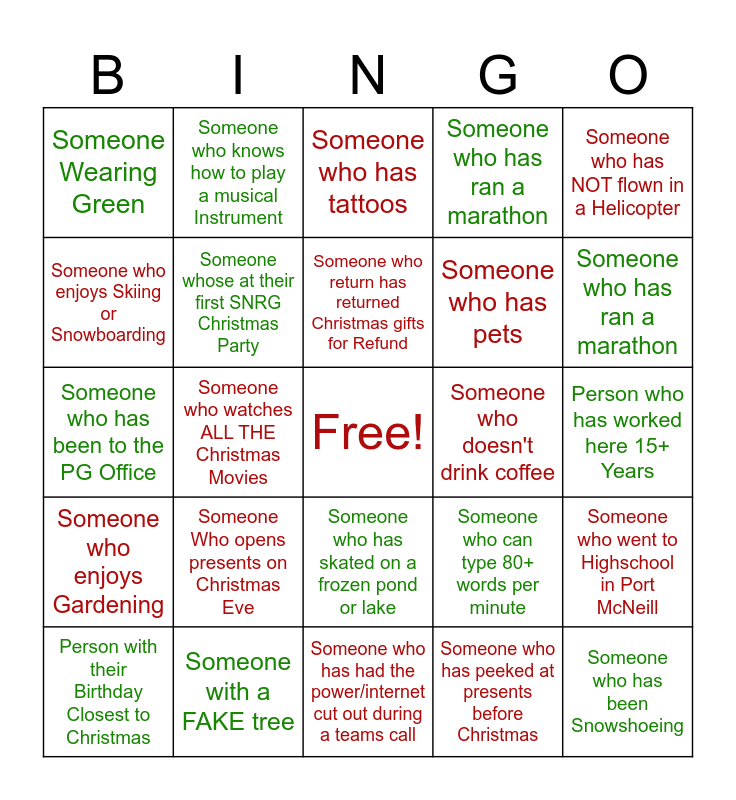This bingo card has a free space and 24 words: Someone Who opens presents on Christmas Eve, Someone with a FAKE tree, Someone who return has returned Christmas gifts for Refund, Person with their Birthday Closest to Christmas, Someone who has NOT flown in a Helicopter, Someone Wearing Green, Someone who enjoys Skiing or Snowboarding, Someone who knows how to play a musical Instrument, Someone who doesn't drink coffee, Someone who has skated on a frozen pond or lake, Someone who has pets, Someone who has been to the PG Office, Someone who can type 80+ words per minute, Someone who went to Highschool in Port McNeill, Someone whose at their first SNRG Christmas Party, Someone who has peeked at presents before Christmas, Person who has worked here 15+ Years, Someone who has tattoos, Someone who has ran a marathon, Someone who watches ALL THE Christmas Movies, Someone who has been Snowshoeing, Someone who enjoys Gardening, Someone who has ran a marathon and Someone who has had the power/internet cut out during a teams call.