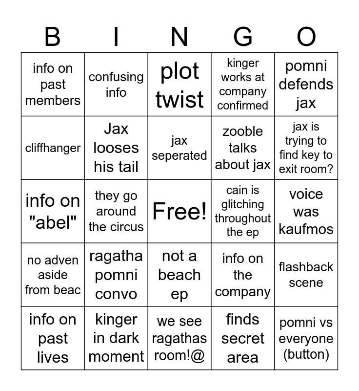 This bingo card has a free space and 24 words: ragatha pomni convo, kinger in dark moment, jax seperated, info on past lives, pomni defends jax, info on past members, cliffhanger, confusing info, cain is glitching throughout the ep, not a beach ep, zooble talks about jax, info on "abel", info on the company, flashback scene, Jax looses his tail, finds secret area, voice was kaufmos, plot twist, jax is trying to find key to exit room?, they go around the circus, pomni vs everyone (button), no adven aside from beac, kinger works at company confirmed and we see ragathas room!@.