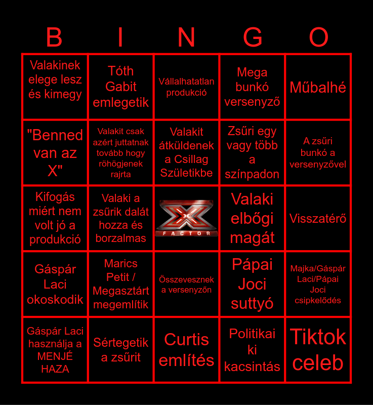 This bingo card has a free space and 24 words: Gáspár Laci használja a MENJÉ HAZA, Marics Petit / Megasztárt megemlítik, Valakit átküldenek a Csillag Születikbe, Politikai ki kacsintás, Műbalhé, Valakinek elege lesz és kimegy, Tóth Gabit emlegetik, Vállalhatatlan produkció, Valaki elbőgi magát, Visszatérő, Kifogás miért nem volt jó a produkció, Valakit csak azért juttatnak tovább hogy röhögjenek rajrta, Pápai Joci suttyó, Majka/Gáspár Laci/Pápai Joci csipkelődés, "Benned van az X", Sértegetik a zsűrit, Curtis említés, Mega bunkó versenyző, A zsűri bunkó a versenyzővel, Gáspár Laci okoskodik, Valaki a zsűrik dalát hozza és borzalmas, Összevesznek a versenyzőn, Zsűri egy vagy több a színpadon and Tiktok celeb.