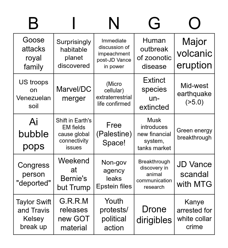 This bingo card has a free space and 24 words: Weekend at Bernie's but Trump, G.R.R.M releases new GOT material, (Micro cellular) extraterrestrial life confirmed, Taylor Swift and Travis Kelsey break up, Major volcanic eruption, Goose attacks royal family, US troops on Venezuelan soil, Surprisingly habitable planet discovered, Musk introduces new financial system, tanks market, Non-gov agency leaks Epstein files, Extinct species un-extincted, Ai bubble pops, Breakthrough discovery in animal communication research, JD Vance scandal with MTG, Marvel/DC merger, Drone dirigibles, Green energy breakthrough, Immediate discussion of impeachment post-JD Vance in power, Mid-west earthquake (>5.0), Shift in Earth's EM fields cause global connectivity issues, Kanye arrested for white collar crime, Congress person "deported", Human outbreak of zoonotic disease and Youth protests/ political action.