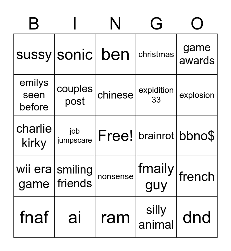 This bingo card has a free space and 24 words: smiling friends, ai, chinese, fnaf, game awards, sussy, emilys seen before, sonic, brainrot, nonsense, expidition 33, charlie kirky, fmaily guy, french, couples post, silly animal, bbno$, ben, explosion, job jumpscare, dnd, wii era game, christmas and ram.