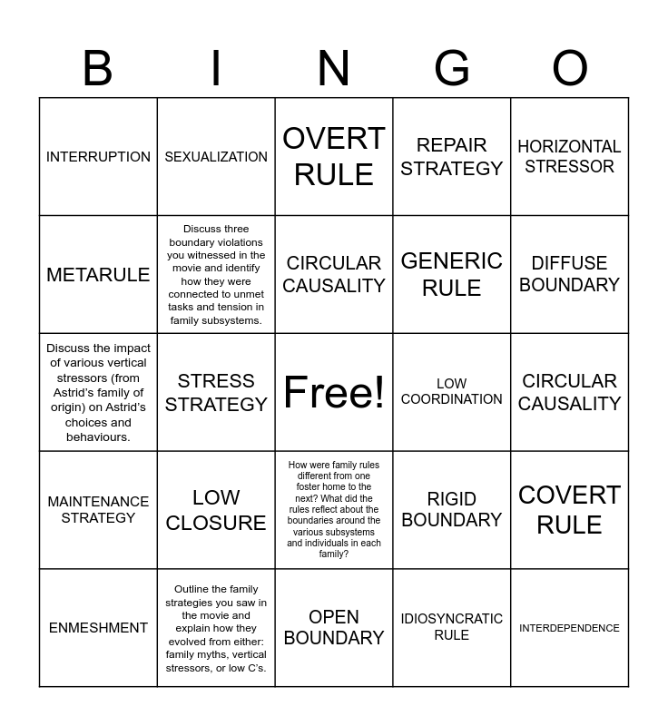 This bingo card has a free space and 40 words: Discuss the circumstances which resulted in Astrid being used as a scapegoat in the various families., Discuss the impact of various vertical stressors (from Astrid’s family of origin) on Astrid’s choices and behaviours., Identify three significant horizontal stressors in the movie and explain how they each unpacked vertical stressors for any of the characters., Discuss three boundary violations you witnessed in the movie and identify how they were connected to unmet tasks and tension in family subsystems., Outline the family strategies you saw in the movie and explain how they evolved from either: family myths, vertical stressors, or low C’s., How were family rules different from one foster home to the next? What did the rules reflect about the boundaries around the various subsystems and individuals in each family?, CIRCULAR CAUSALITY, VERTICAL STRESSOR, HORIZONTAL STRESSOR, MAINTENANCE STRATEGY, STRESS STRATEGY, REPAIR STRATEGY, INTERDEPENDENCE, CIRCULAR CAUSALITY, LOW COORDINATION, LOW CLOSURE, LOW CONFIGURATION, INTERRUPTION, CRISES, OVERT RULE, COVERT RULE, IDIOSYNCRATIC RULE, GENERIC RULE, METARULE, REDUNDANCY PRINCIPLE, FAMILY MYTH, PSEUDOMUTUALITY, PSEUDOHOSTILITY, MYSTIFICATION, DOUBLE LEVEL COMMUNICATION, DOUBLE BIND COMMUNICATION, ENMESHMENT, DISENGAGEMENT, RIGID BOUNDARY, DIFFUSE BOUNDARY, OPEN BOUNDARY, INFANTILIZATION, ADULTIFICATION, SEXUALIZATION and SCAPEGOATING.