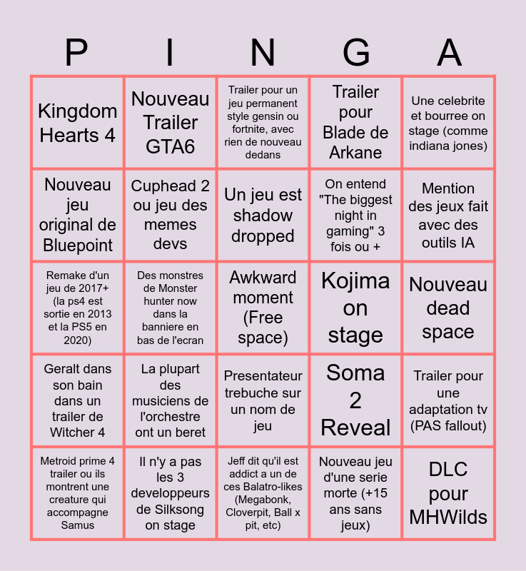 This bingo card has a free space and 24 words: La plupart des musiciens de l'orchestre ont un beret, Il n'y a pas les 3 developpeurs de Silksong on stage, Un jeu est shadow dropped, Metroid prime 4 trailer ou ils montrent une creature qui accompagne Samus, Une celebrite et bourree on stage (comme indiana jones), Kingdom Hearts 4, Nouveau jeu original de Bluepoint, Nouveau Trailer GTA6, Kojima on stage, Presentateur trebuche sur un nom de jeu, On entend "The biggest night in gaming" 3 fois ou +, Remake d'un jeu de 2017+ (la ps4 est sortie en 2013 et la PS5 en 2020), Soma 2 Reveal, Trailer pour une adaptation tv (PAS fallout), Cuphead 2 ou jeu des memes devs, Nouveau jeu d'une serie morte (+15 ans sans jeux), Nouveau dead space, Trailer pour un jeu permanent style gensin ou fortnite, avec rien de nouveau dedans, Mention des jeux fait avec des outils IA, Des monstres de Monster hunter now dans la banniere en bas de l'ecran, DLC pour MHWilds, Geralt dans son bain dans un trailer de Witcher 4, Trailer pour Blade de Arkane and Jeff dit qu'il est addict a un de ces Balatro-likes (Megabonk, Cloverpit, Ball x pit, etc).