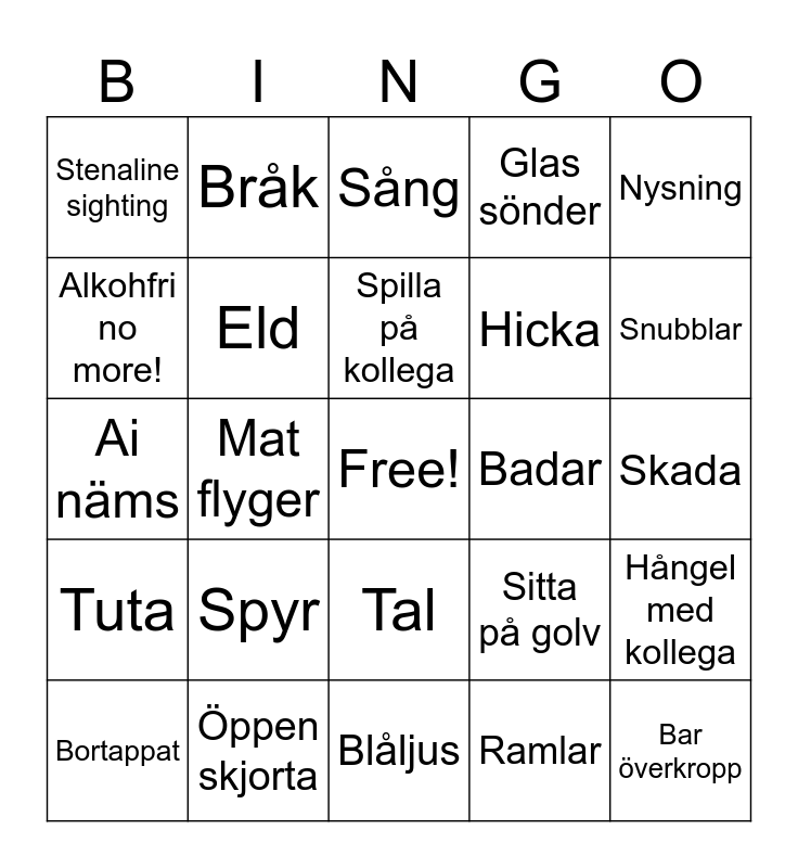 This bingo card has a free space and 24 words: Spyr, Öppen skjorta, Spilla på kollega, Bortappat, Nysning, Stenaline sighting, Alkohfri no more!, Bråk, Badar, Tal, Hicka, Ai näms, Sitta på golv, Hångel med kollega, Eld, Ramlar, Skada, Sång, Snubblar, Mat flyger, Bar överkropp, Tuta, Glas sönder and Blåljus.