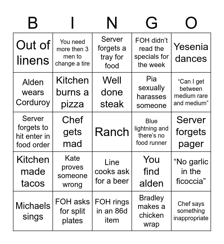 This bingo card has a free space and 29 words: Michaels sings, “Can you a make kids cheese pizza”, Chef gets mad, Freezer breaks down, Out of linens, Server forgets a tray for food, Kitchen burns a pizza, Kate proves someone wrong, Blue lightning and there’s no food runner, FOH asks for split plates, Server forgets pager, Chef says something inappropriate, FOH rings in an 86d item, Bradley makes a chicken wrap, “Can I get between medium rare and medium”, Sam uses the pantry as his lunchbox, Line cooks ask for a beer, Kitchen made tacos, Yesenia dances, Server forgets to hit enter in food order, You find alden, Yesenia can’t reach something, Pia sexually harasses someone, Alden wears Corduroy, FOH didn’t read the specials for the week, You need more then 3 men to change a tire, “No garlic in the ficoccia”, Well done steak and Is it gluten free?.