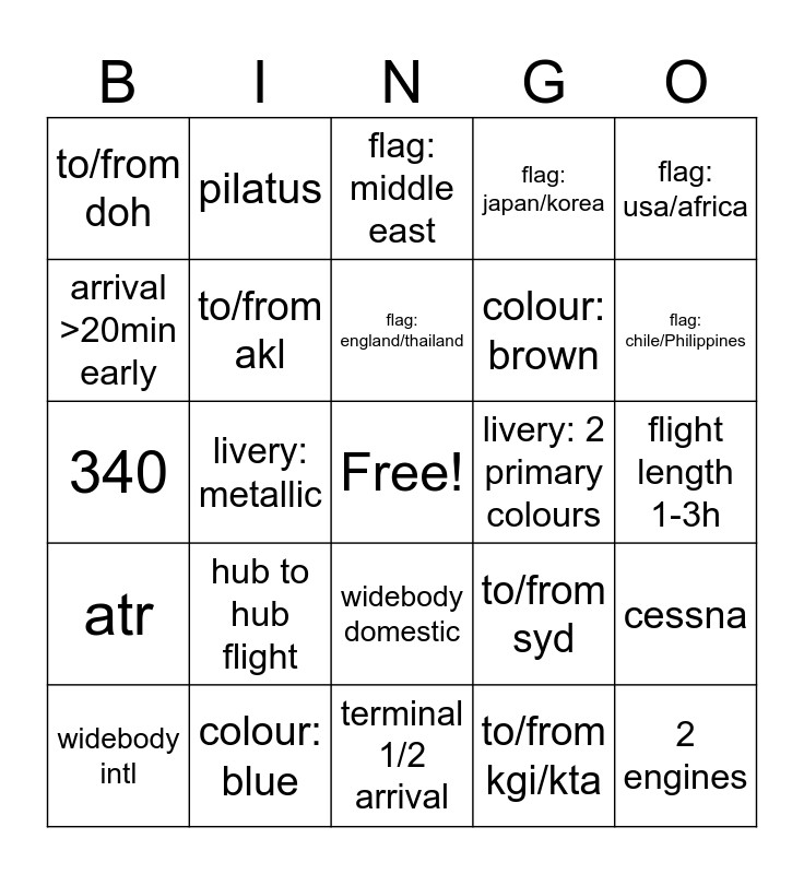 This bingo card has a free space and 109 words: livery: animal, livery: tri-colour, livery: 2 primary colours, plane without wingtips, plane with singular wingtips, plane with split-schimitar wingtips, 4 engines, 737, 777, 787, 319, 330, 320, 321, 350, 380, 340, dc8, fokker, embraer, cessna, king beechair, flag: china, flag: Singapore, flag: Indonesia, flag: england/thailand, flag: usa/africa, barometric altitude: <2000ft, barometric altitude: 2000-4000ft, barometric altitude: >4000ft, flag: chile/Philippines, flag: japan/korea, flag: middle east, flag: finland/malaysia, flag: india/vietnam, 2 engines, colour: black, colour: red, colour: blue, colour: green, colour: yellow, colour: orange, colour: brown, livery: metallic, to/from syd, to/from adl, to/from hba, to/from cns/ool, to/from tsv/ntl, to/from bne, to/from mel, to/from avv/cbr, to/from kgi/kta, to/from dps, to/from cgk, to/from sin, to/from kul, to/from hkg, to/from sgn, to/from akl, to/from doh, to/from mnl, to/from drw/bme, to/from phe/epr, to/from get/alh, to/from europe, to/from africa, to/from lea/lst, to/from zne/pbo, from/to bkk, SF34, pilatus, atr, airbus -neo plane, boeing MAX plane, flight length >1h, flight length 1-3h, flight length 3-5h, flight length 6-8h, flight length 8-12h, flight length >12h, takeoff delayed <15min, takeoff delayed >15min, flight in holding pattern, altitude >30000ft, wet lease, dry lease, arrival <20min early, arrival >20min early, arrival <30min late, arrival >30min late, hub to hub flight, hub to spoke flight, flight block 3:20-3:40, flight path directly north, flight path directly south, flight path directly east, to/from any island, terminal 1/2 arrival, terminal 3/4 arrival, terminal 1/2 departure, terminal 3/4 departure, widebody intl, widebody domestic, narrowbody intl, depart runway 03/21, depart runway 06/24, arrive runway 03/21 and arrive runway 06/24.