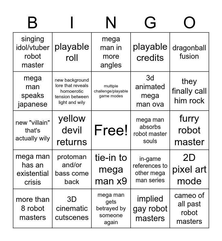 This bingo card has a free space and 24 words: protoman and/or bass come back, 3D cinematic cutscenes, multiple challenge/playable game modes, more than 8 robot masters, dragonball fusion, singing idol/vtuber robot master, mega man speaks japanese, playable roll, mega man absorbs robot master souls, tie-in to mega man x9, 3d animated mega man ova, new "villain" that's actually wily, in-game references to other mega man series, 2D pixel art mode, new background lore that reveals homoerotic tension between light and wily, implied gay robot masters, furry robot master, mega man in more angles, they finally call him rock, yellow devil returns, cameo of all past robot masters, mega man has an existential crisis, playable credits and mega man gets betrayed by someone again.