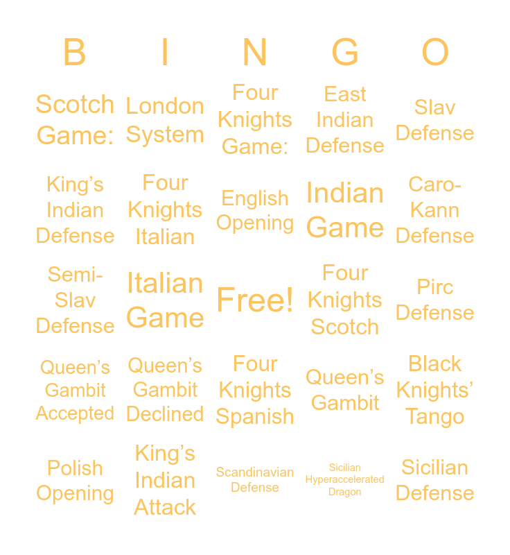 This bingo card has a free space and 30 words: King’s Indian Attack, King’s Pawn, Italian Game, Spanish Opening:, Scotch Game:, Four Knights Game:, Four Knights Italian, Four Knights Spanish, Four Knights Scotch, Scandinavian Defense, Pirc Defense, Sicilian Defense, Sicilian Hyperaccelerated Dragon, Old Sicilian, Caro-Kann Defense, Queen’s Pawn, Queen’s Gambit, Queen’s Gambit Accepted, Queen’s Gambit Declined, Slav Defense, Semi-Slav Defense, Slav-Indian Defense, London System, Indian Game, King’s Indian Defense, East Indian Defense, Black Knights’ Tango, Polish Opening, English Opening and Réti Opening.