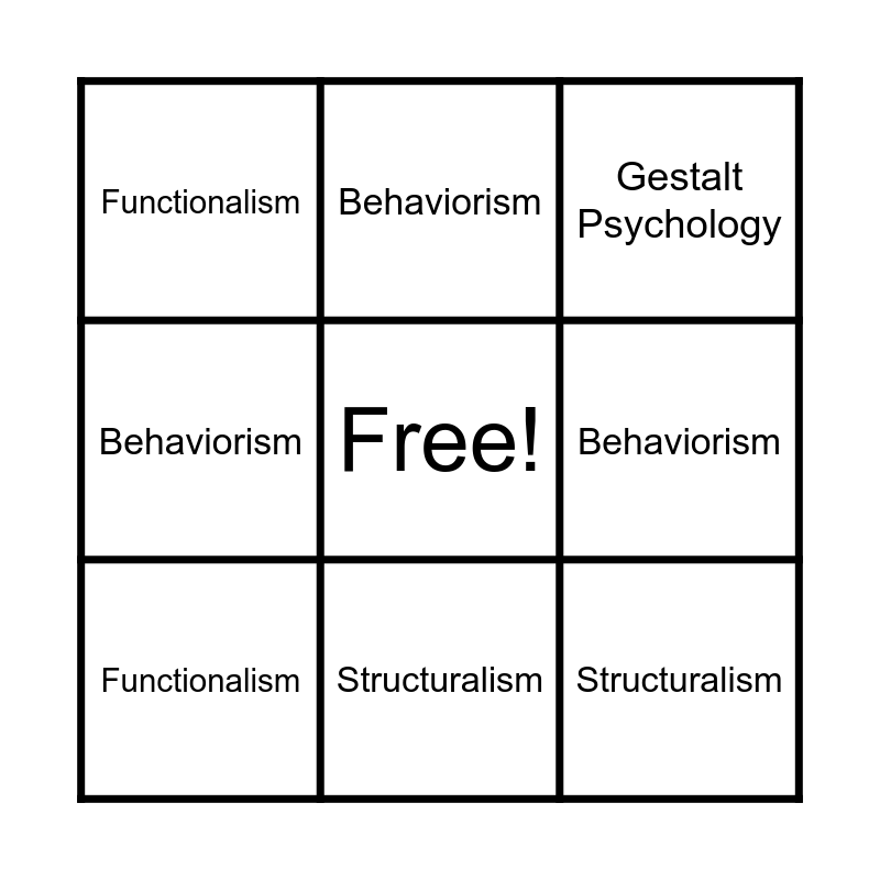 This bingo card has a free space and 16 words: Structuralism, Behaviorism, Gestalt Psychology, Functionalism, Structuralism, Behaviorism, Gestalt Psychology Functionalism, Structuralism, Structuralism, Behaviorism, Gestalt Psychology, Functionalism, Structuralism, Behaviorism, Gestalt Psychology and Functionalism.
