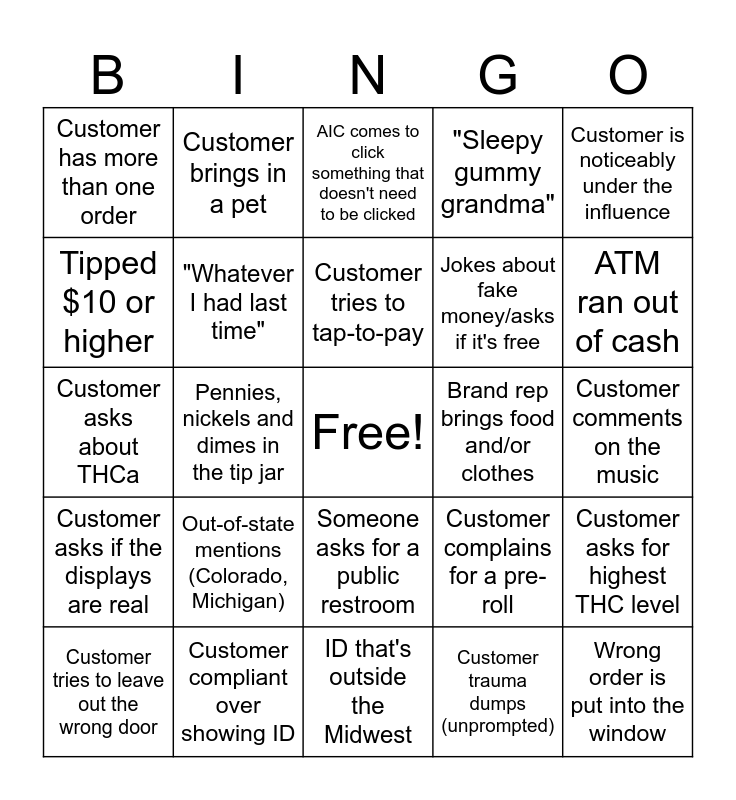 This bingo card has a free space and 24 words: Out-of-state mentions (Colorado, Michigan), Customer compliant over showing ID, Customer tries to tap-to-pay, Customer tries to leave out the wrong door, Customer is noticeably under the influence, Customer has more than one order, Tipped $10 or higher, Customer brings in a pet, Brand rep brings food and/or clothes, Someone asks for a public restroom, Jokes about fake money/asks if it's free, Customer asks about THCa, Customer complains for a pre-roll, Customer asks for highest THC level, "Whatever I had last time", Customer trauma dumps (unprompted), Customer comments on the music, AIC comes to click something that doesn't need to be clicked, ATM ran out of cash, Pennies, nickels and dimes in the tip jar, Wrong order is put into the window, Customer asks if the displays are real, "Sleepy gummy grandma" and ID that's outside the Midwest.