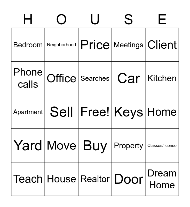 This bingo card has a free space and 30 words: House, Loan, Sell, Signs, Bedroom, Price, Office, Buy, Keys, Realtor, Home, Dream Home, Door, Bathroom, Kitchen, Open House, Property, Yard, Move, Client, Apartment, Listing, Neighborhood, Car, Phone calls, Meetings, Classes/license, Teach, Searches and Talk, talk. talk.
